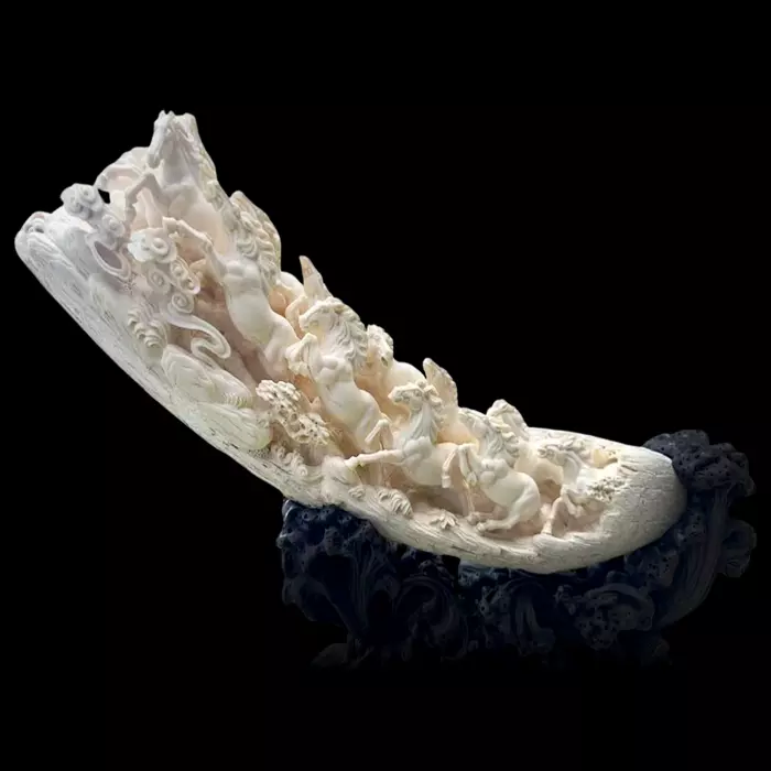 Композиция из бивня мамонта «Десять тысяч скачущих лошадей» представляет собой динамичное и выразительное произведение, в котором природная форма бивня превращена в символ стремительного движения и неудержимой энергии. Благородный материал с мягкими кремовыми переливами придаёт сцене живое внутреннее свечение, а изогнутая линия композиции усиливает ощущение разгона, словно вся сцена разворачивается в одном мощном импульсе. Основание из тёмного резного дерева создаёт контраст и визуально удерживает этот поток движения, подчёркивая статус и художественную ценность объекта.