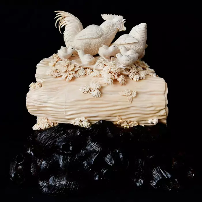 Композиция из бивня мамонта "Довольство курятника: куриная семья"