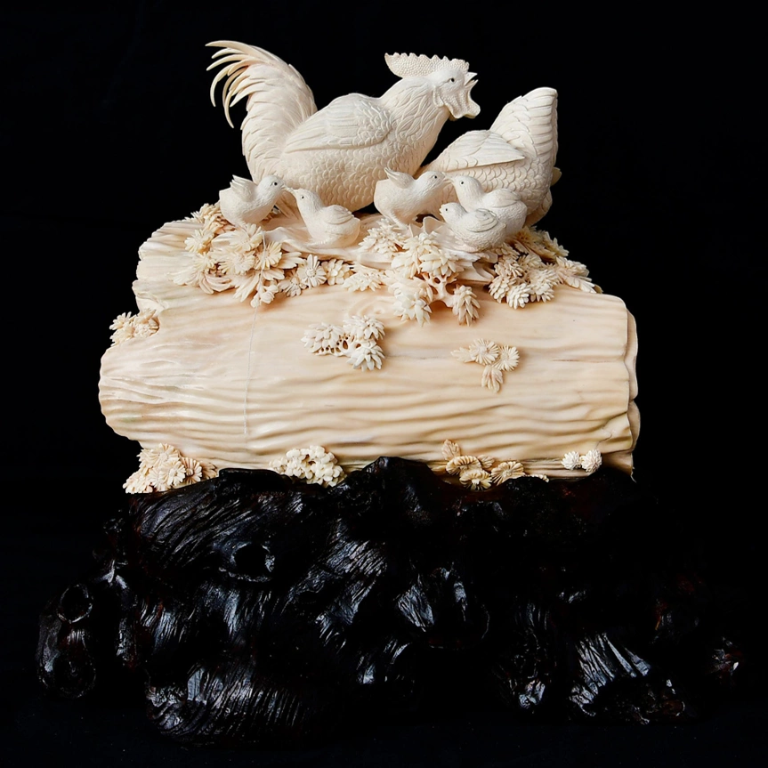 Композиция из бивня мамонта «Довольство курятника: куриная семья» представляет собой утончённую сцену, наполненную символикой домашнего благополучия и спокойного достатка. Выполненная из цельного бивня мамонта, работа сохраняет природную теплоту материала, его мягкий кремовый оттенок и живую текстуру. Основание из тёмного резного дерева создаёт выразительный контраст, подчёркивая светлую пластичность композиции и придавая ей завершённый коллекционный характер.