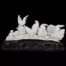 Кантонская техника резьбы раскрывается в филигранной проработке: тонкие линии оперения, мягкие переходы форм, глубина рельефа создают многослойность и визуальную насыщенность. Композиция воспринимается как цельный сюжет, раскрывающийся при внимательном рассмотрении — взгляд последовательно перемещается от центрального образа к окружающим элементам, открывая новые нюансы и детали.
