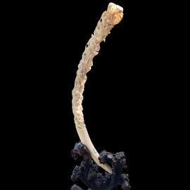 Композиция из бивня мамонта «Год за годом изобилия» — утончённое произведение, в котором природный материал раскрыт через сложную, почти ювелирную резьбу и глубокую символику. Вертикально вытянутая форма бивня превращена в изящный художественный образ, наполненный множеством тончайших деталей: плавные линии, прорезные элементы и рельефные мотивы создают ощущение живого, непрерывного движения. Верхняя часть композиции словно устремляется вверх, усиливая впечатление роста, развития и бесконечного потока жизненной энергии. Такой объект воспринимается как редкий арт-экземпляр, способный задать особое настроение пространству.