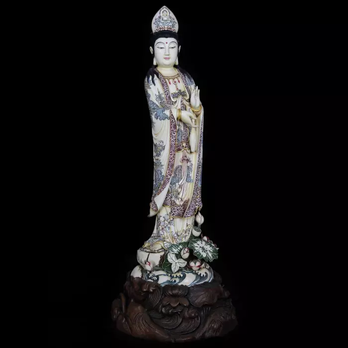 Композиция из бивня мамонта «Гуаньинь, льющая воду» раскрывает один из самых поэтичных и глубоких образов буддийской традиции — богиню милосердия, дарующую очищение и покой. Гуаньинь здесь предстает в момент тихого действия: вода, льющаяся из сосуда, символизирует не просто физический поток, а благословение, способное смывать страдания, тревоги и внутренние смятения. В китайской культуре такой жест воспринимается как акт духовного очищения и обновления.