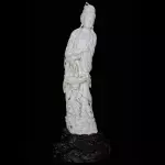 Композиция из бивня мамонта «Гуаньинь с корзиной рыбы» раскрывает один из особых и менее очевидных образов богини милосердия — воплощение её способности являться в человеческом мире в разных обличиях. Этот сюжет связан с популярной в китайской традиции легендой о «Гуаньинь с рыбой», где богиня принимает земной облик, чтобы наставить людей на путь добродетели и духовного понимания. Такой образ подчёркивает идею: сострадание проявляется не только в небесной сфере, но и в повседневной жизни.