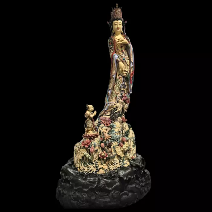 Композиция из бивня мамонта «Гуаньинь с ребёнком» представляет собой изысканное произведение восточной скульптурной традиции, соединяющее утончённое мастерство резьбы по мамонтовой кости и глубокую духовную символику буддийской культуры. Скульптура установлена на сложном декоративном основании, напоминающем природный каменный рельеф с цветами лотоса, волнами и растительными мотивами, что создаёт ощущение живой природной среды.