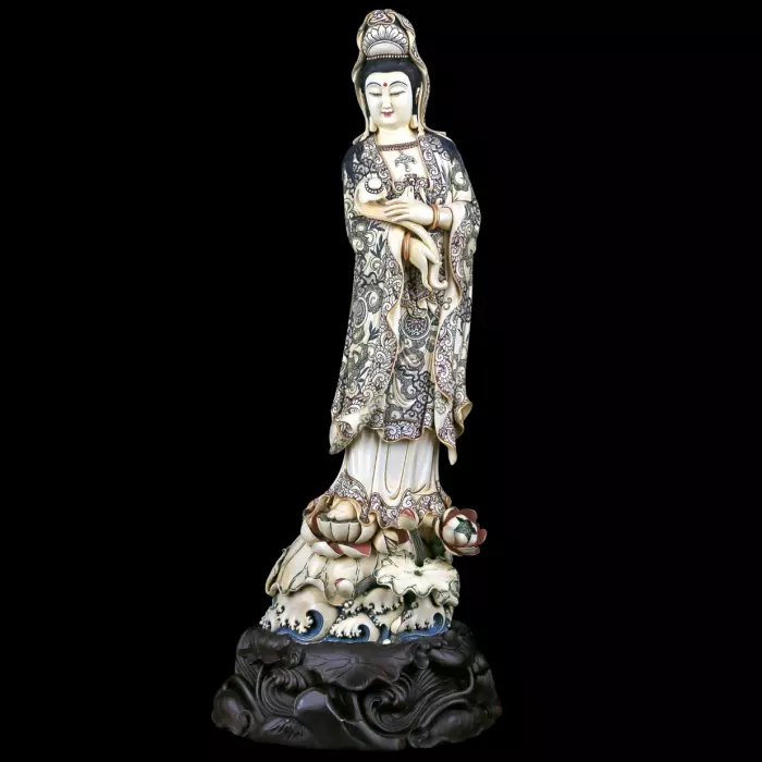 Композиция из бивня мамонта «Гуаньинь с жезлом жуи» воплощает один из самых почитаемых образов восточной духовной традиции — богиню милосердия и сострадания. Гуаньинь в китайской культуре воспринимается как заступница, слышащая молитвы и откликающаяся на страдания людей, дарующая утешение, защиту и надежду. Её образ связан с идеей безусловной доброты и внутренней чистоты, способной преобразить судьбу человека.