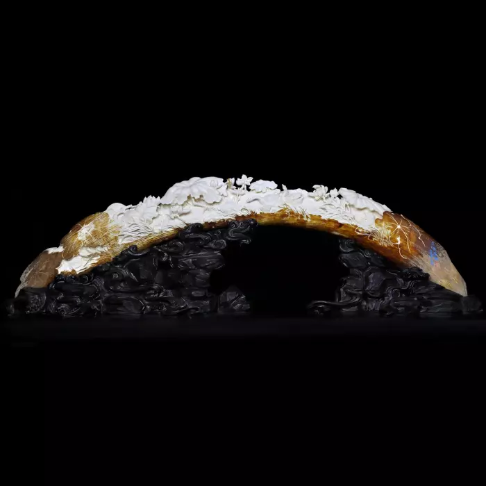 Естественный переход оттенков — от тёплого янтарного края к молочно-белой резной поверхности — добавляет глубину и подчёркивает природное происхождение бивня. Этот контраст воспринимается как граница между плотной материей и утончённым, почти эфемерным образом цветущего мира.