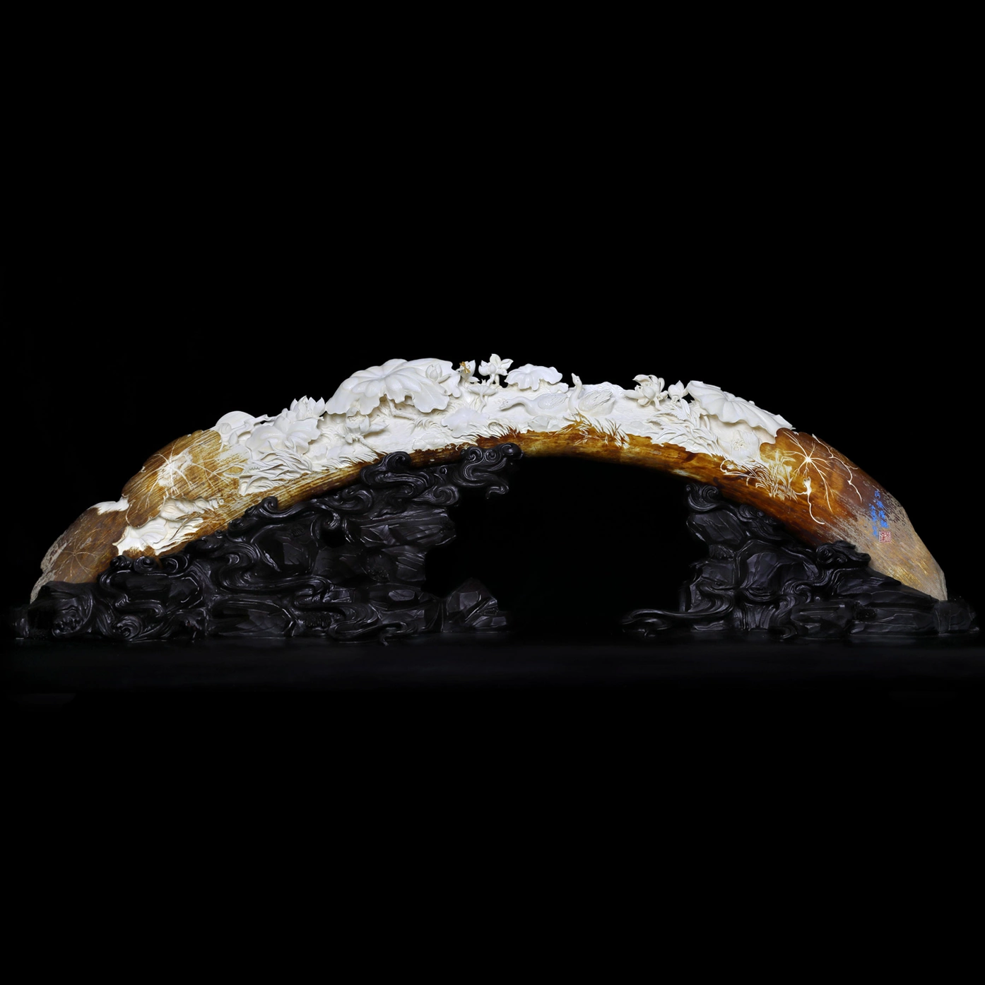 «Идиллия у лотосового пруда» — это произведение, обращённое к состоянию покоя и внутреннего равновесия. В нём соединяются редкость бивня мамонта, тончайшее мастерство резьбы и символический язык восточной традиции, передающий идею гармонии, чистоты и созерцательной красоты.