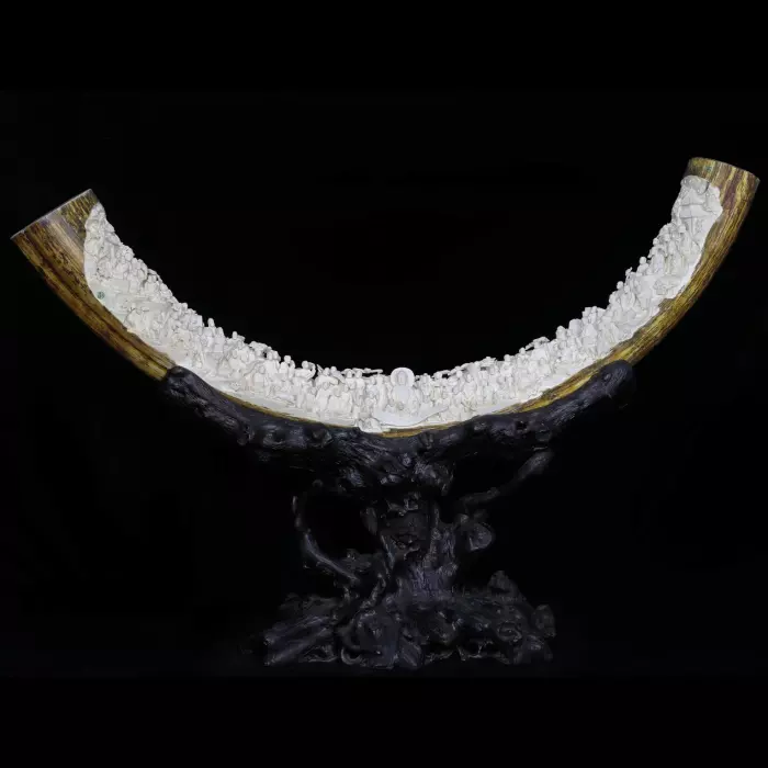 Композиция из бивня мамонта «Изображение изложения Дхармы» обращается к одной из центральных тем буддийской традиции — передаче учения, раскрытию истины и пути к освобождению. Само название указывает на момент проповеди Дхармы — сакрального знания, которое Будда передаёт ученикам, открывая им природу страдания, его причины и путь к просветлению. В китайской культуре такие сцены воспринимаются не как исторический эпизод, а как вечный акт — знание, которое непрерывно передаётся от учителя к ученику.
