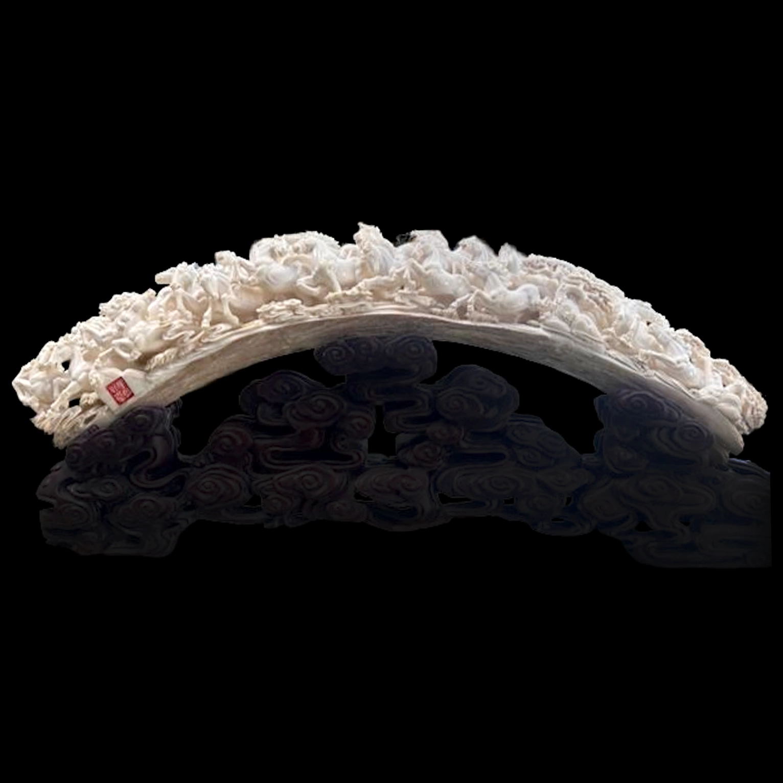 По всей длине бивня развёрнута сцена стремительного движения: табун лошадей, выстроенный в едином потоке, словно захвачен единым импульсом. Фигуры переходят одна в другую, образуя непрерывную линию энергии, где каждая лошадь сохраняет индивидуальность — в повороте головы, изгибе корпуса, напряжении мускулов. Композиция развивается плавно, но с нарастающей динамикой, создавая ощущение бесконечного движения вперёд, где пространство и форма сливаются в единый поток.
