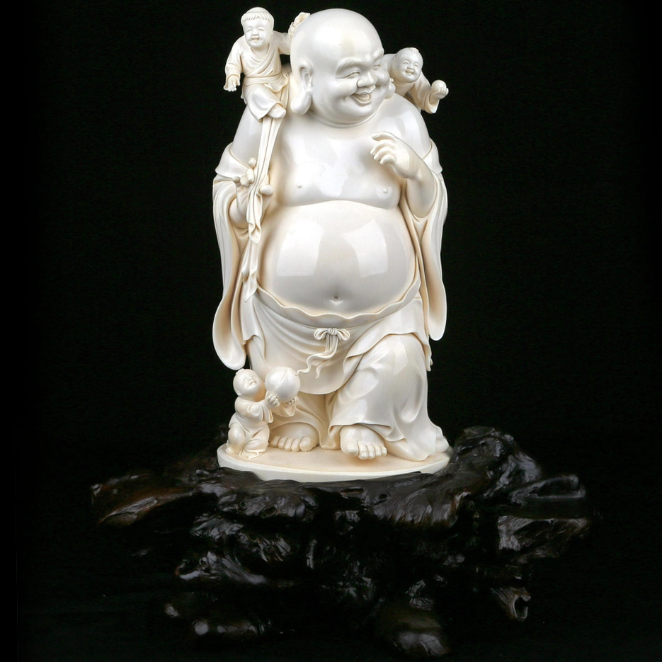 Композиция из бивня мамонта «Майтрейя с тремя детьми» воплощает один из самых благоприятных сюжетов китайской символики, объединяющий идеи радости, изобилия и продолжения рода. Майтрейя, изображённый в образе смеющегося Будды, ассоциируется с будущим временем счастья, когда мир наполнится гармонией и беззаботностью. Его улыбка и открытая, жизнерадостная энергия передают состояние внутреннего благополучия, не зависящего от внешних обстоятельств.