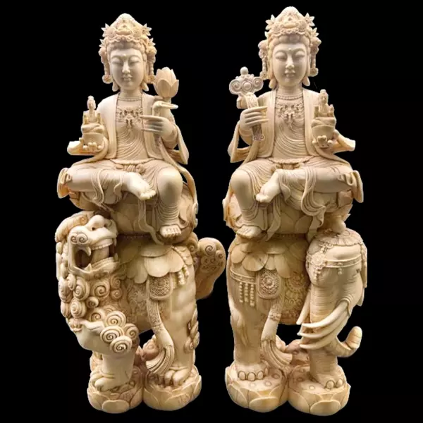 Композиция из бивня мамонта «Манджушри Самантабхадра» представляет собой глубокое философское произведение, объединяющее в себе образы двух великих бодхисаттв, олицетворяющих высшие духовные качества — мудрость и добродетельное действие. Скульптуры выполнены из благородного бивня мамонта, обладающего мягким кремовым оттенком и естественным внутренним свечением, что придаёт образам особую одухотворённость и торжественную чистоту. Парная композиция выстроена симметрично, усиливая ощущение баланса и гармонии, а резные основания и фигуры животных — льва и слона — подчёркивают статус и символическое значение каждого образа.