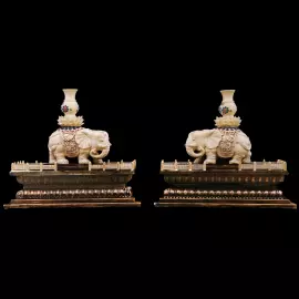 В композиции представлены два величественных слона, выполненных в паре. Парные фигуры в восточной символике всегда означают баланс и гармонию — соединение двух сил, находящихся в равновесии. Слоны изображены спокойными и уверенными, словно медленно движутся вперёд, неся на своих спинах драгоценные сосуды. Такие сосуды в китайской культуре символизируют накопленное благополучие, духовное богатство и процветание.