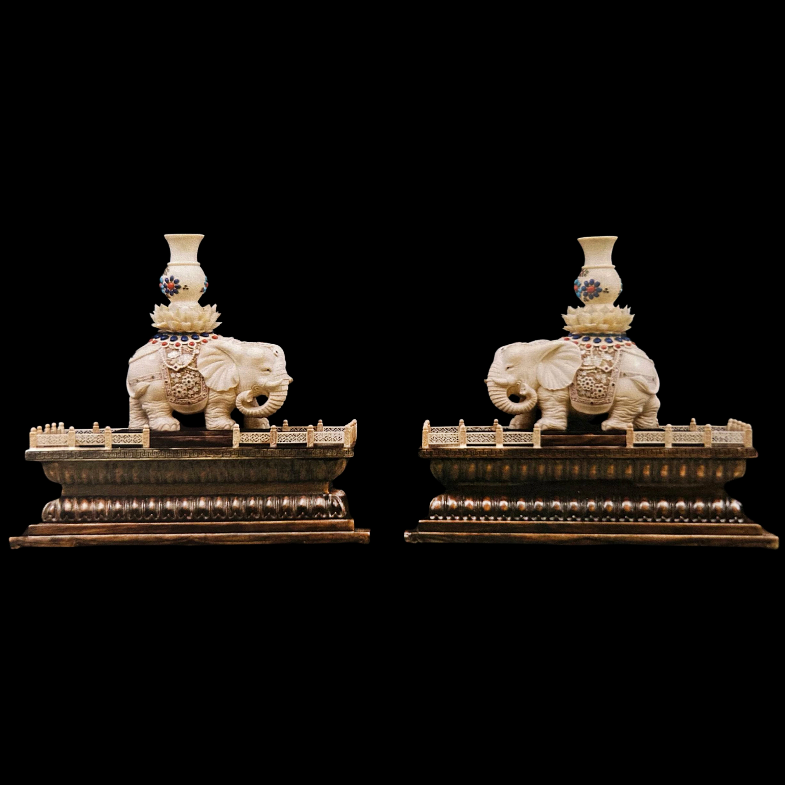Особое значение имеет лотосовое основание под вазами. Лотос является символом чистоты, просветления и внутренней гармонии. Его лепестки напоминают о духовной ясности, которая сохраняется даже среди жизненных испытаний. Таким образом, композиция объединяет в себе силу слона и чистоту лотоса — два образа, выражающие устойчивость и спокойствие.