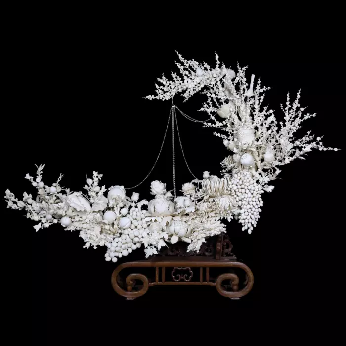 Верхняя часть композиции напоминает цветущее дерево, символизирующее жизненную энергию и непрерывное обновление мира. Ветви, покрытые множеством мелких цветков, создают ощущение вечной весны — состояния, когда природа находится в моменте полного расцвета.