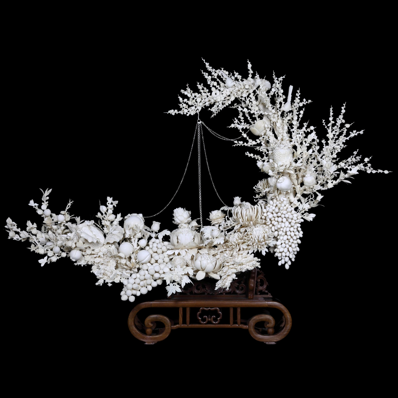Тонкая резьба создаёт невероятную глубину композиции. Каждый лепесток, каждая ягода, каждый изгиб ветви выполнены с ювелирной точностью. Благодаря этому скульптура напоминает кружевной сад, словно созданный из света и воздуха. При смене угла зрения композиция раскрывается по-новому, позволяя рассматривать всё новые детали.