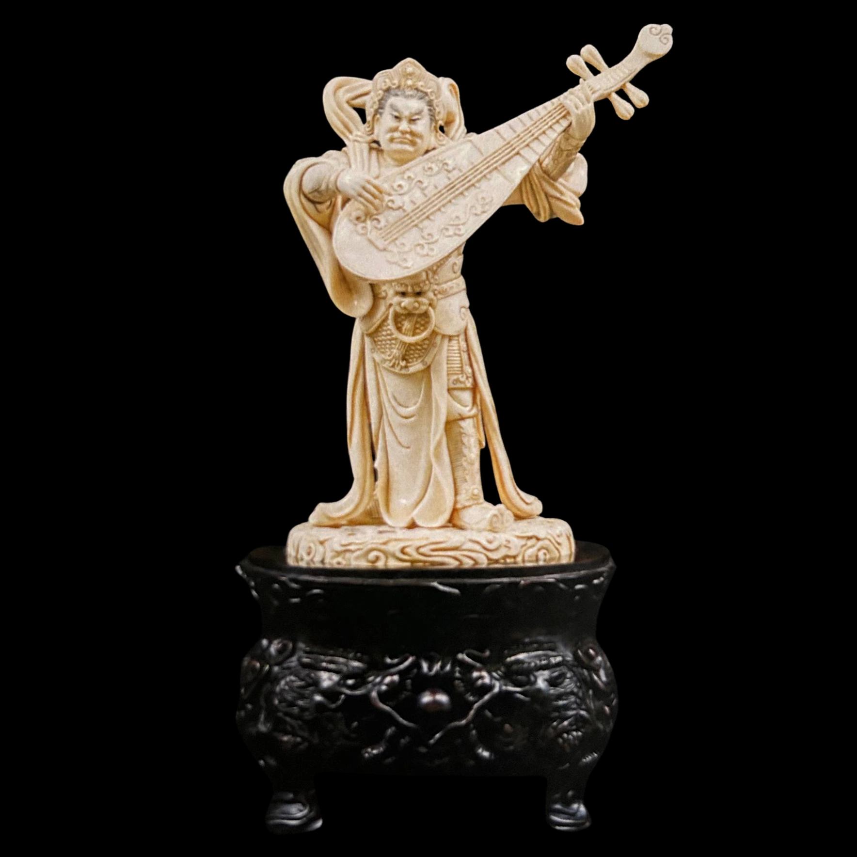 Светлая поверхность бивня мамонта подчёркивает тонкую пластику резьбы: тщательно проработаны складки одежды, орнаменты на инструменте, детали доспехов и выражение лица. Фигура возвышается на тёмном резном основании, украшенном изображениями драконов, что усиливает контраст материалов и придаёт композиции торжественность. В этом произведении древний материал соединяется с символикой восточной духовной традиции, создавая образ могущественного небесного защитника и хранителя гармонии мира.