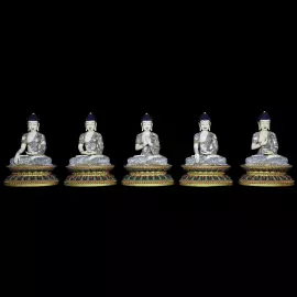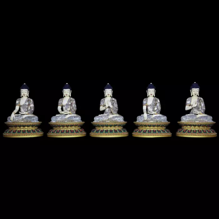 Все пять Будд изображены в медитативных позах, каждая из которых выражает особый жест — мудру, отражающую различные пути духовного постижения. Эти жесты символизируют разные состояния просветления: мудрость, сострадание, внутреннее равновесие, защиту и преодоление невежества. Вместе они образуют единую систему духовной гармонии, отражающую буддийское представление о совершенстве сознания.