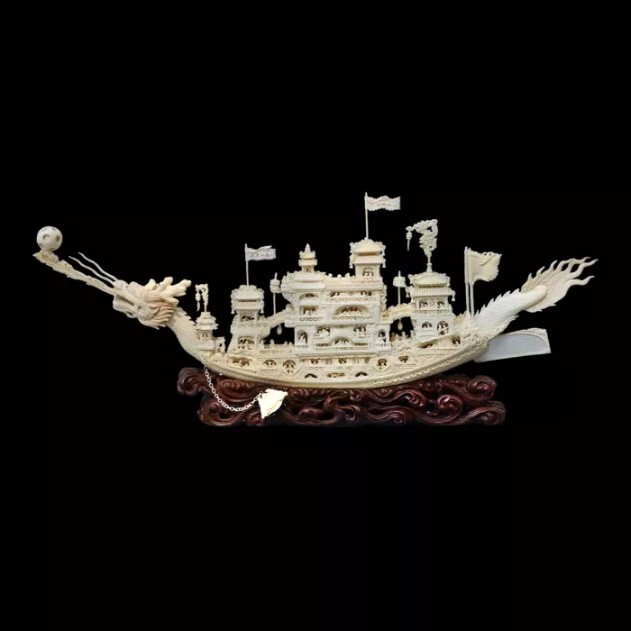 Работа, выполненная из древнего бивня мамонта, изображает миниатюрное роскошное судно в форме дракона. Его гордо поднятая голова и развевающиеся разноцветные флаги символизируют благоприятное будущее, лёгкое плавание и успешное возвращение.