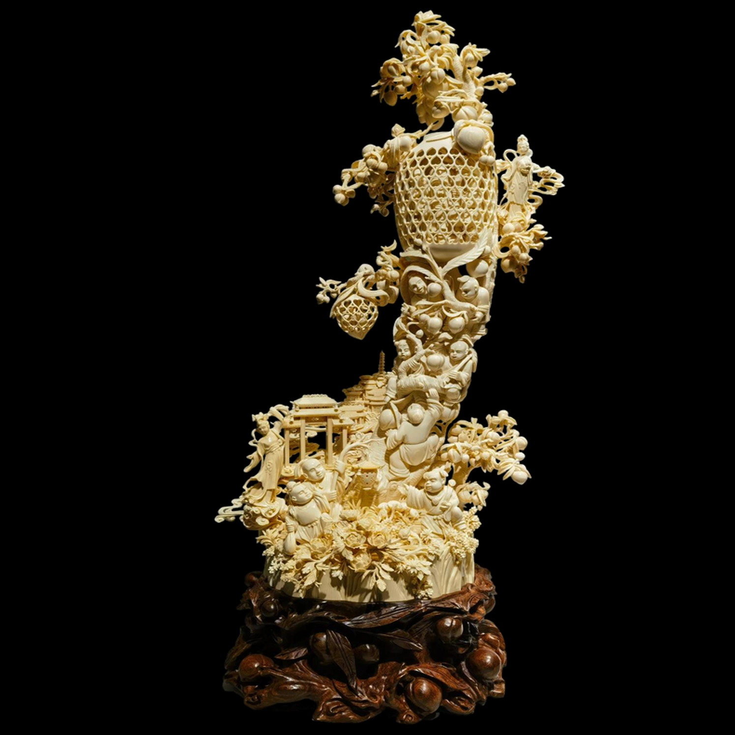 Произведение выполнено в уникальной ажурной технике традиционной гуанчжоуской резьбы по кости. Композиция символизирует благоприятные благословения, долголетие, проццветание и благополучие, передавая атмосферу радости и светлой надежды.