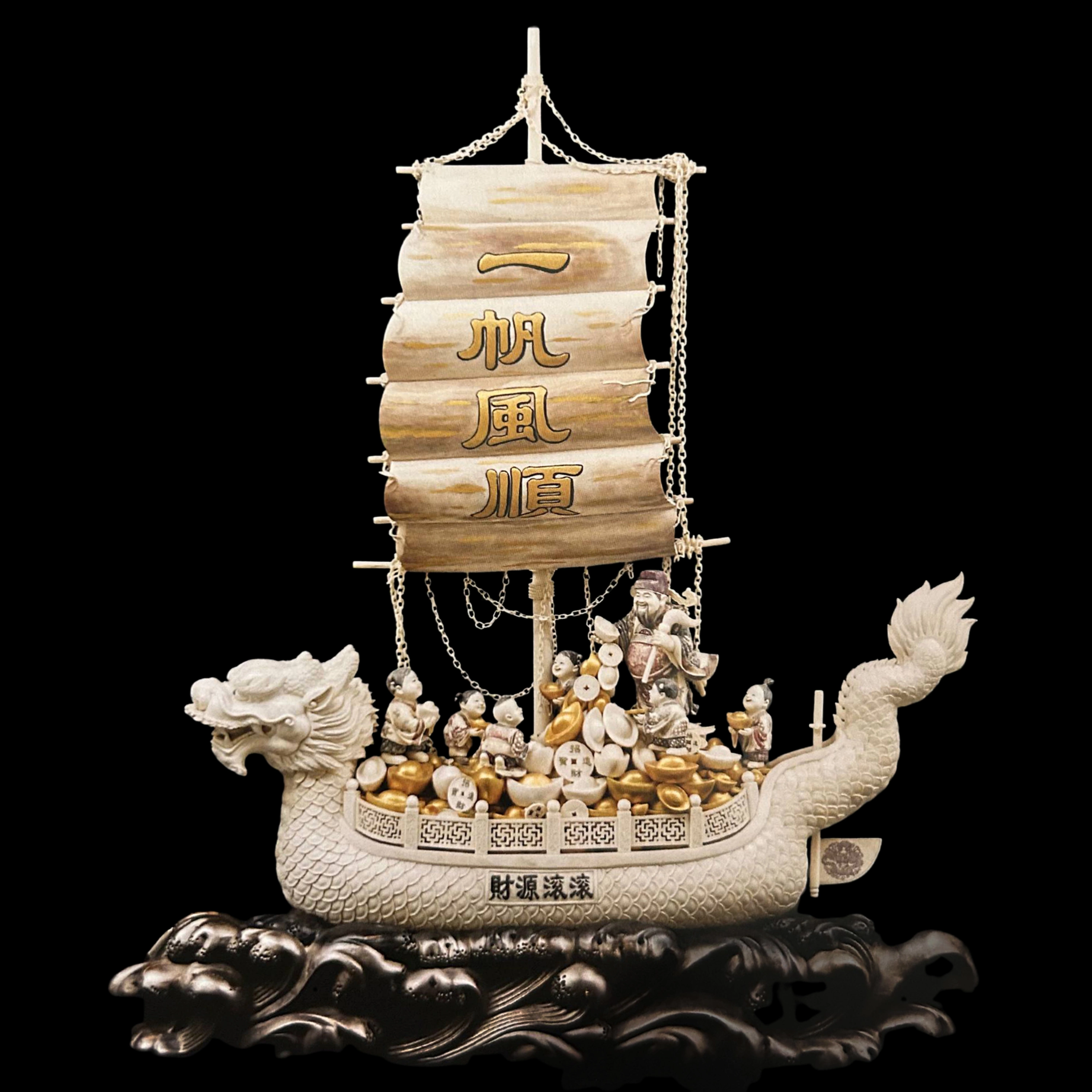 Композиция из бивня мамонта «Попутного ветра — богатство льётся рекой» воплощает один из самых благопожелательных образов китайской символики — корабль, наполненный сокровищами, уверенно идущий по волнам судьбы. В китайской культуре такой корабль считается мощным символом процветания, успешной торговли и удачи в делах. Он означает благополучное путешествие по жизненному пути, когда обстоятельства складываются благоприятно и всё движется вперёд легко и уверенно.