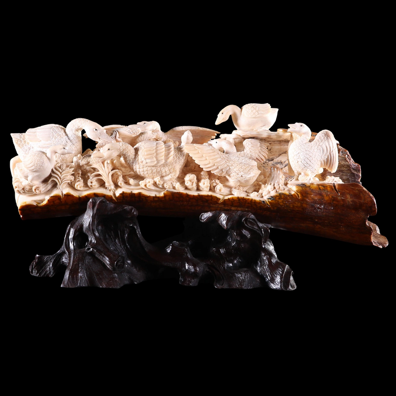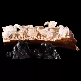 Композиция из бивня мамонта «Потомство гусака в радостном согласии» выполнена из цельного фрагмента бивня, в котором сохранены природные изгибы и богатая палитра оттенков — от светлого молочного до глубокого тёплого янтарного у основания. Естественная структура материала становится частью художественного замысла, создавая ощущение живой, органично сформированной сцены. Скульптурная группа размещена на массивном резном основании из тёмной древесины, подчёркивающем светлую пластику кости и усиливающем контраст композиции.