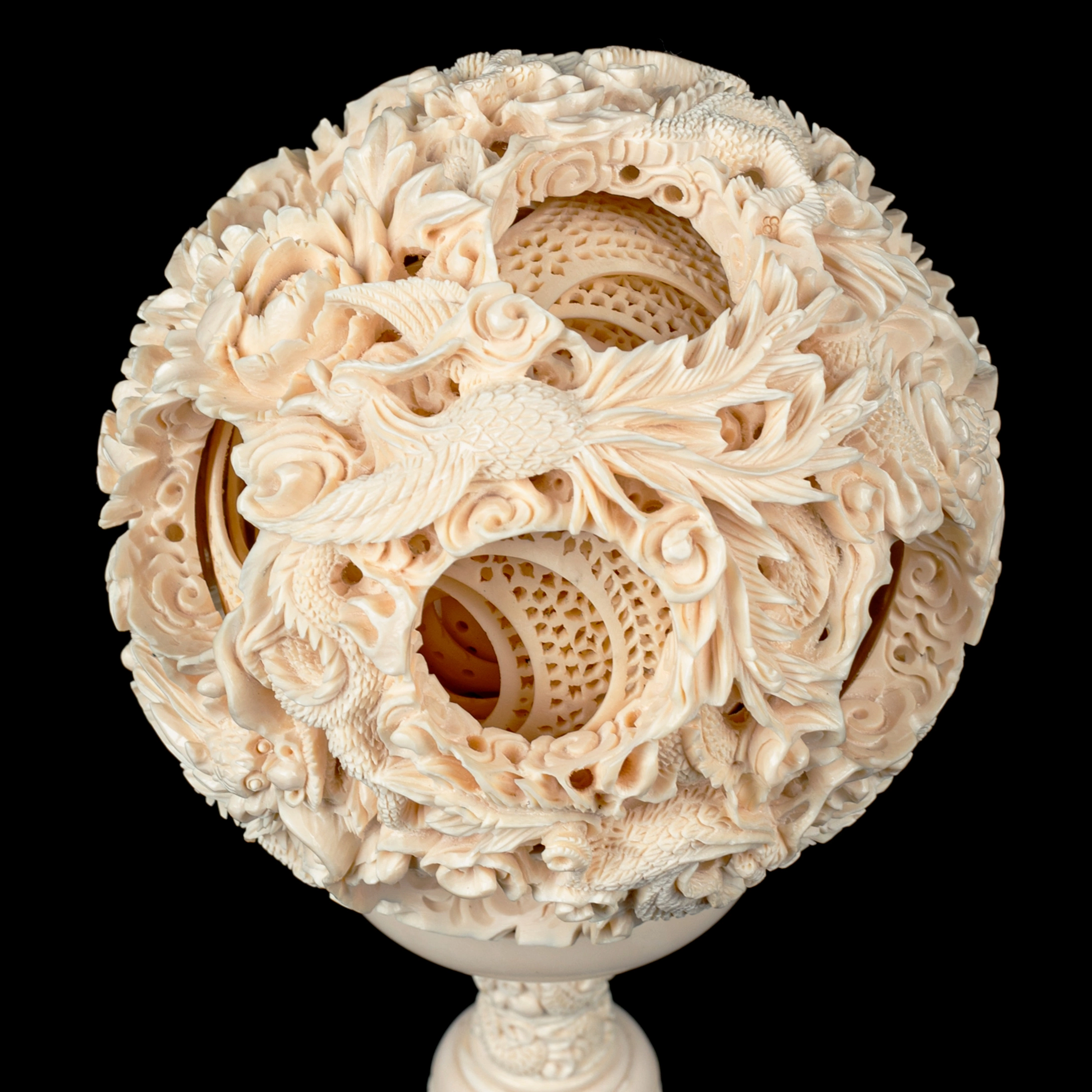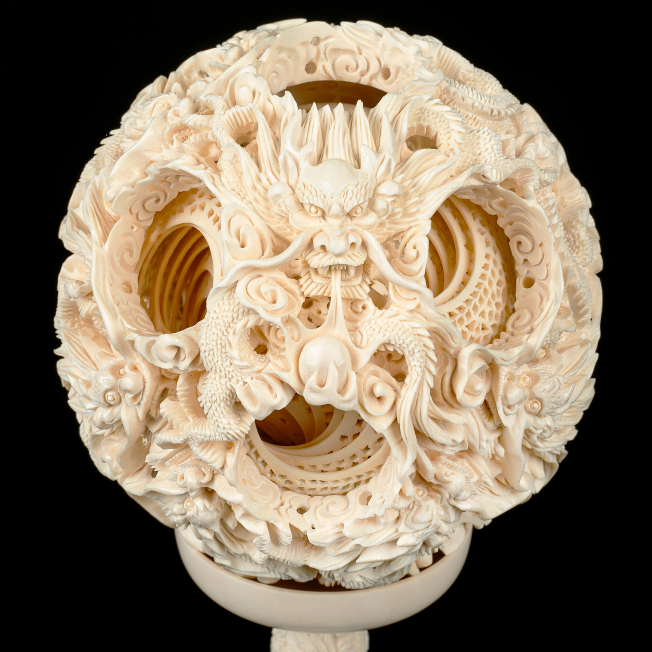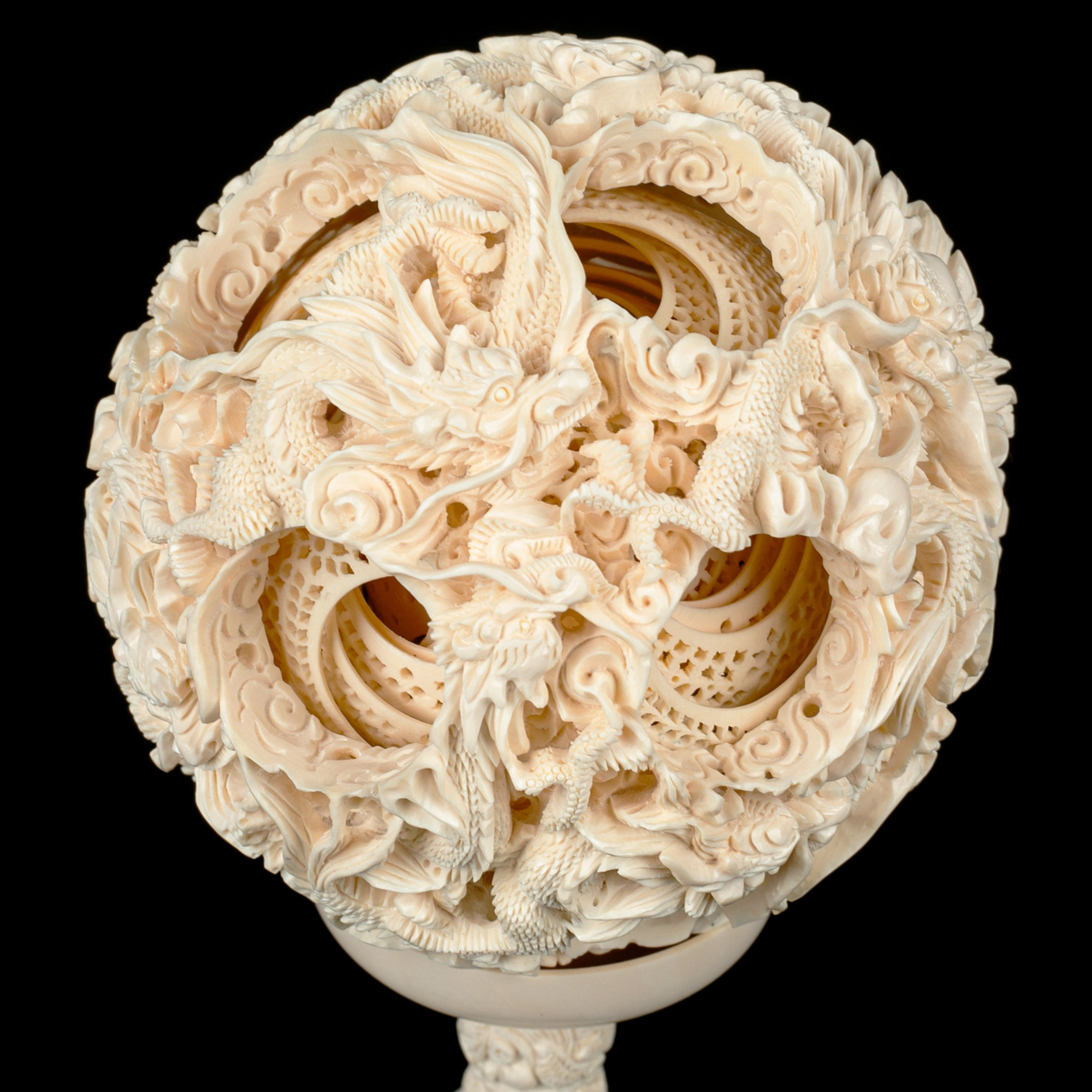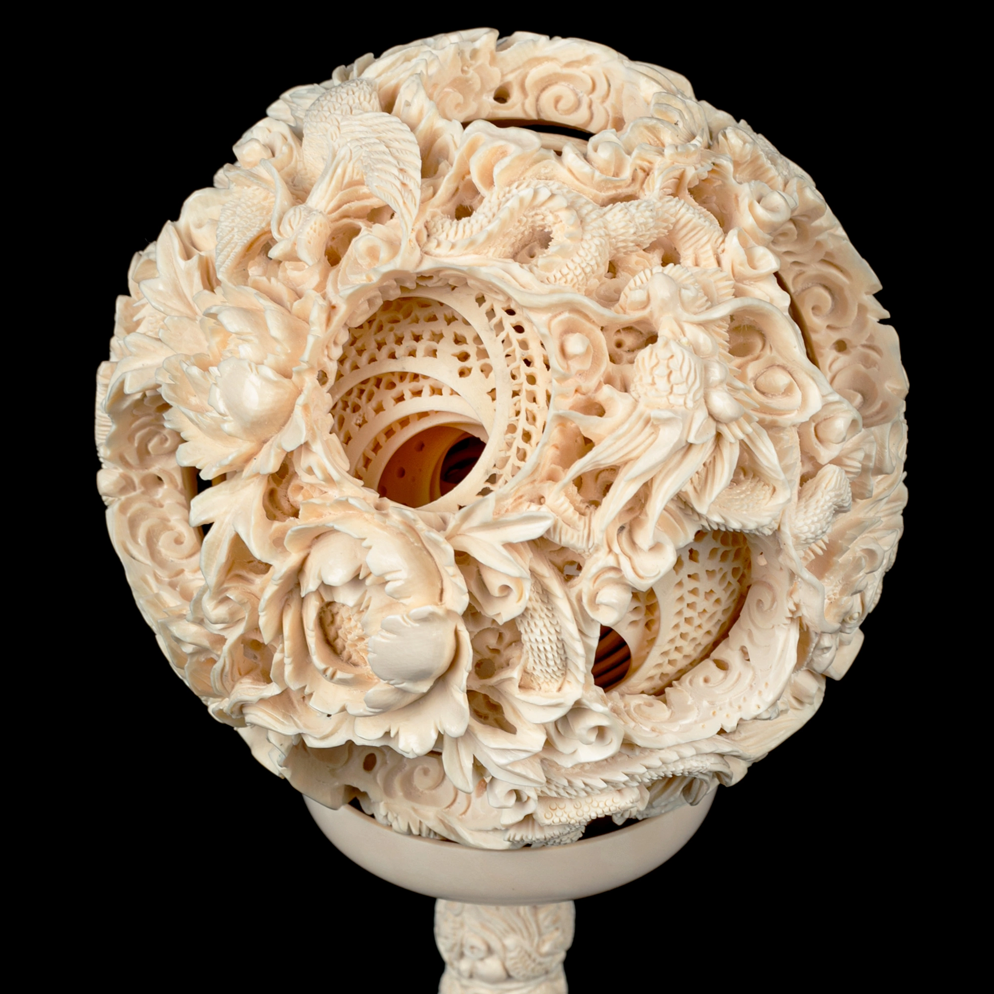 Кантонский шар из слоновой кости, известный также как «призрачный шар», — один из наиболее характерных видов гуанчжоуской резьбы, сформировавшийся ещё в эпоху династии Мин. Его уникальность заключается в том, что цельный фрагмент кости выдалбливается в многослойную сферу с переплетающимися ажурными оболочками. Каждый слой тонко проработан собственным сквозным орнаментом и может свободно вращаться внутри последующего, создавая впечатление лёгкости и почти невесомой прозрачности.
