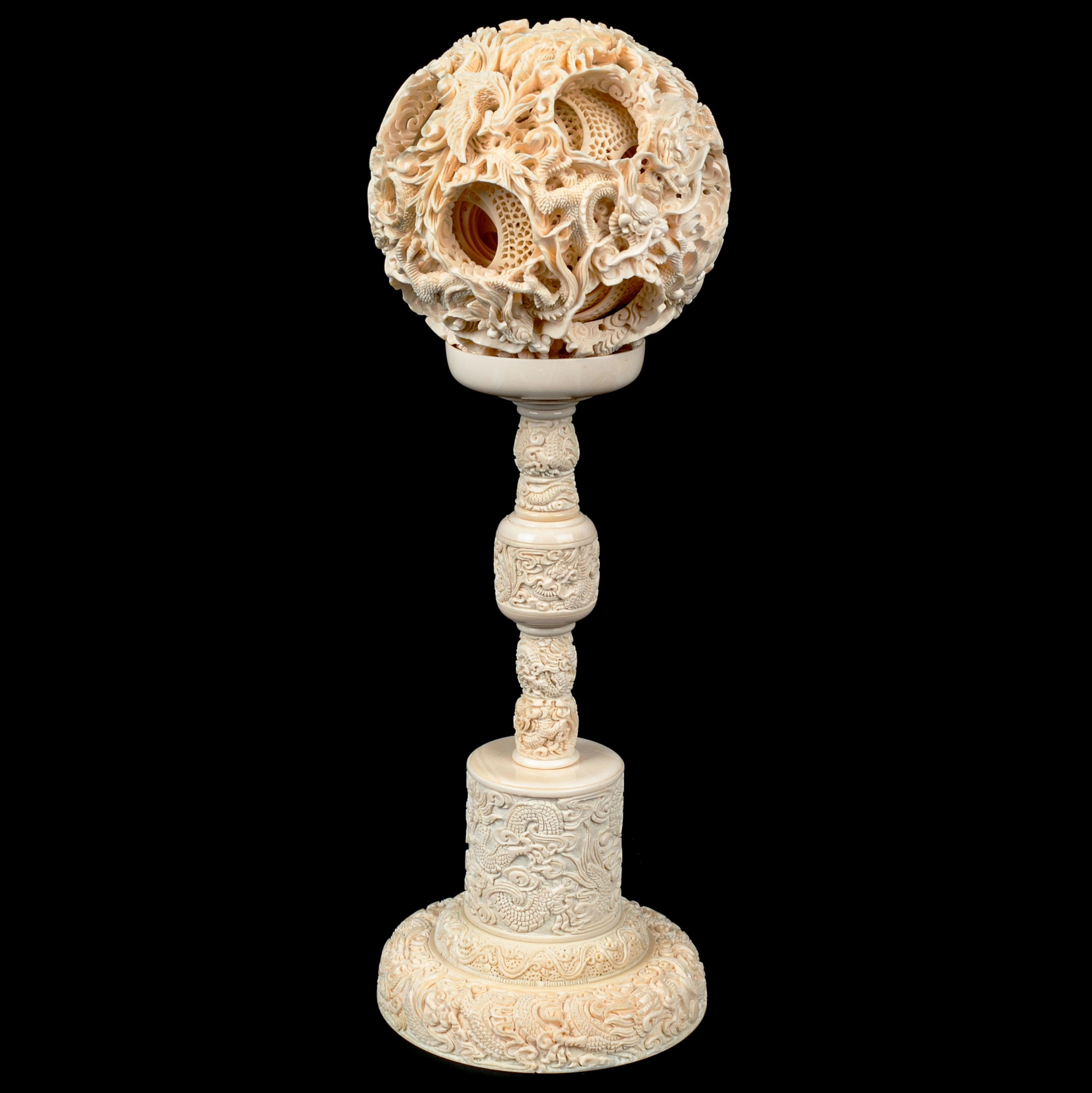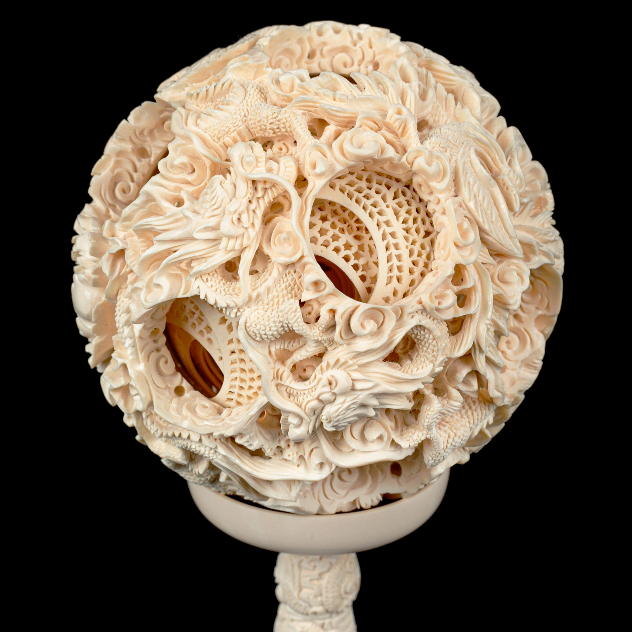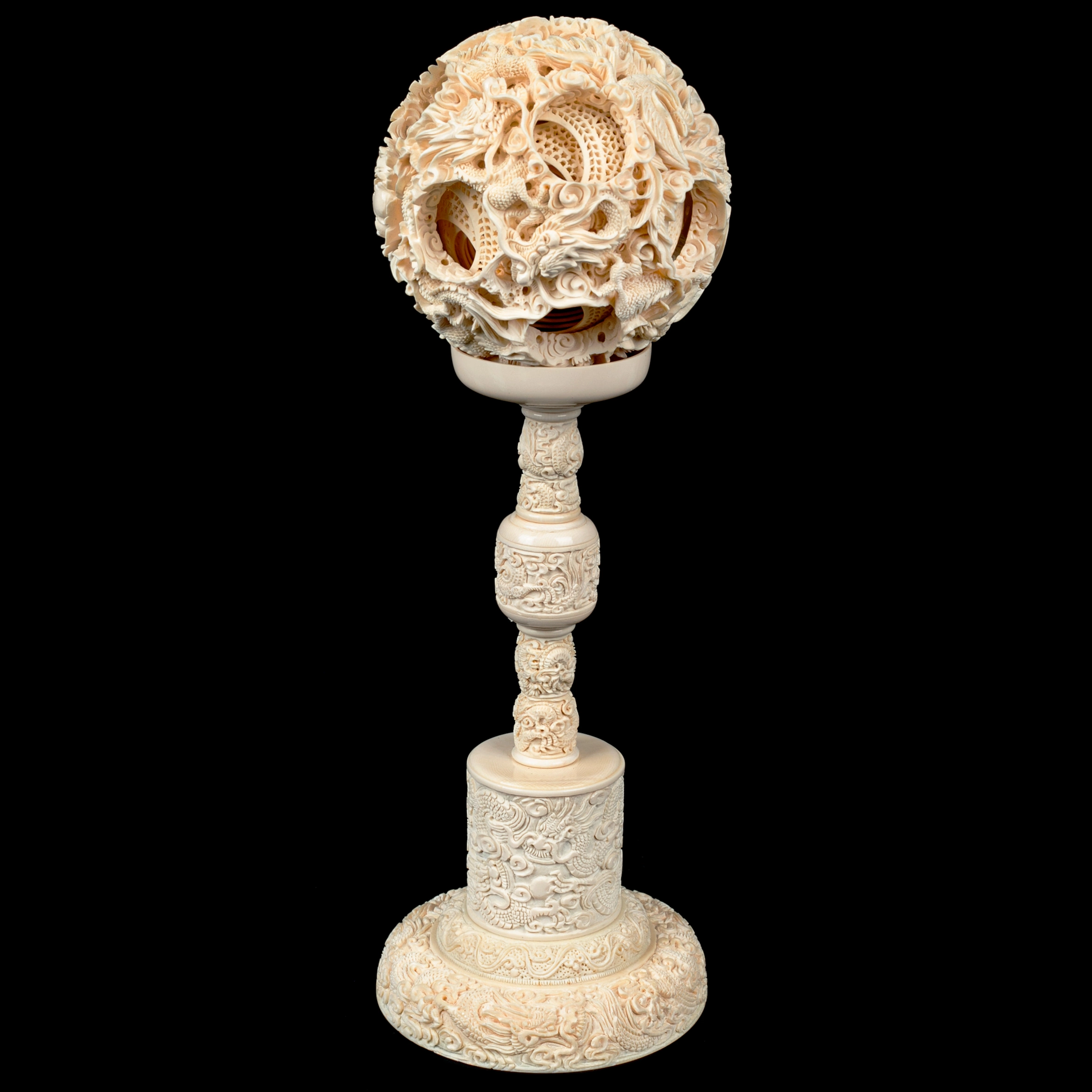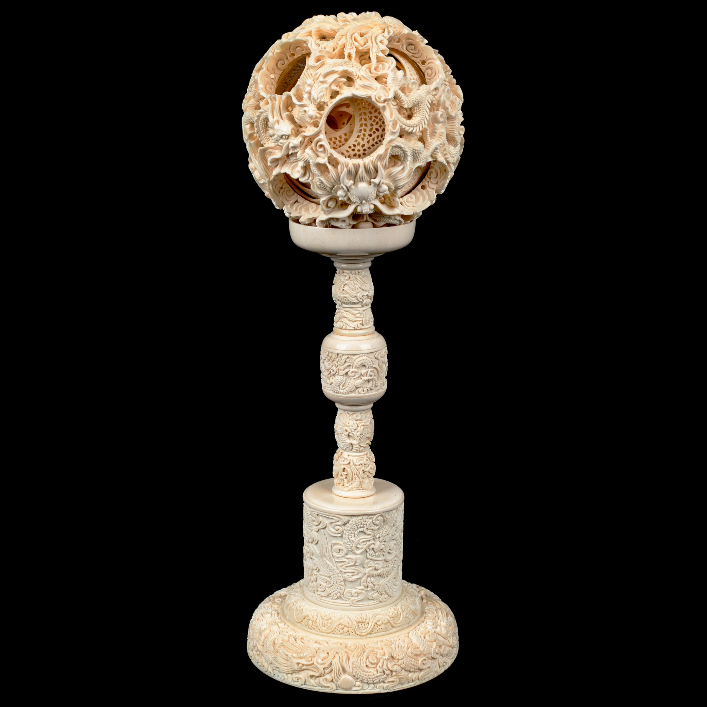 Кантонский шар из слоновой кости, известный также как «призрачный шар», — один из наиболее характерных видов гуанчжоуской резьбы, сформировавшийся ещё в эпоху династии Мин. Его уникальность заключается в том, что цельный фрагмент кости выдалбливается в многослойную сферу с переплетающимися ажурными оболочками. Каждый слой тонко проработан собственным сквозным орнаментом и может свободно вращаться внутри последующего, создавая впечатление лёгкости и почти невесомой прозрачности.