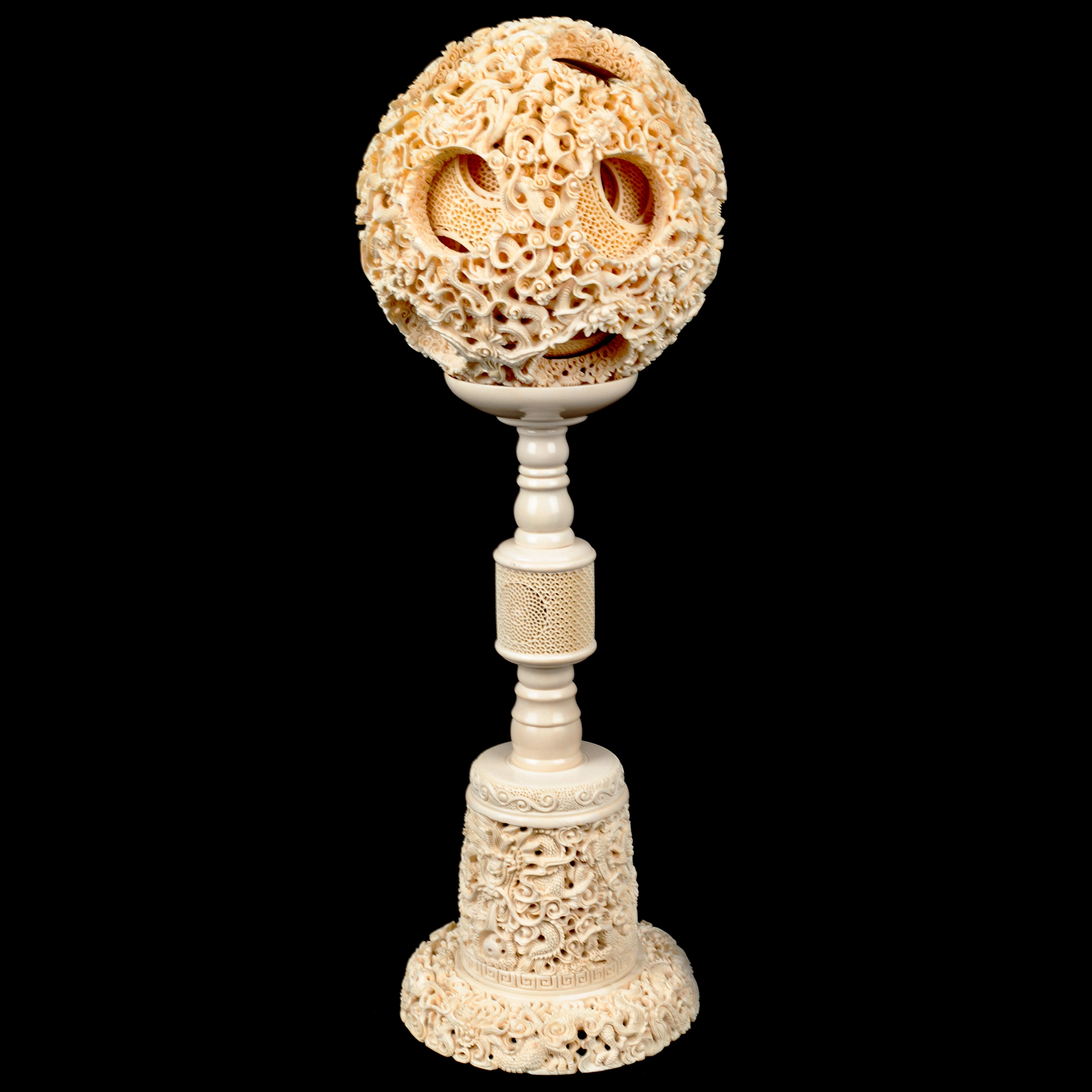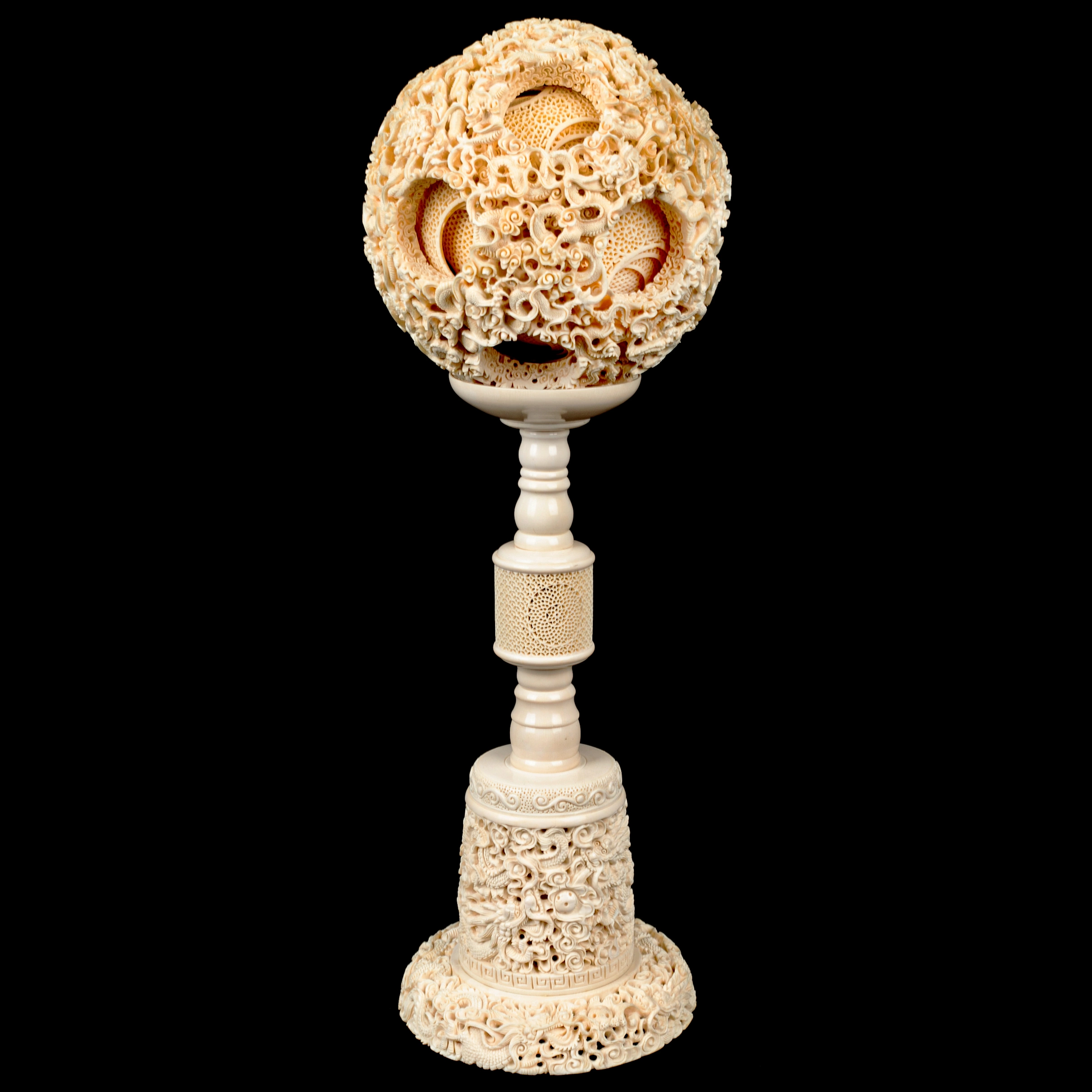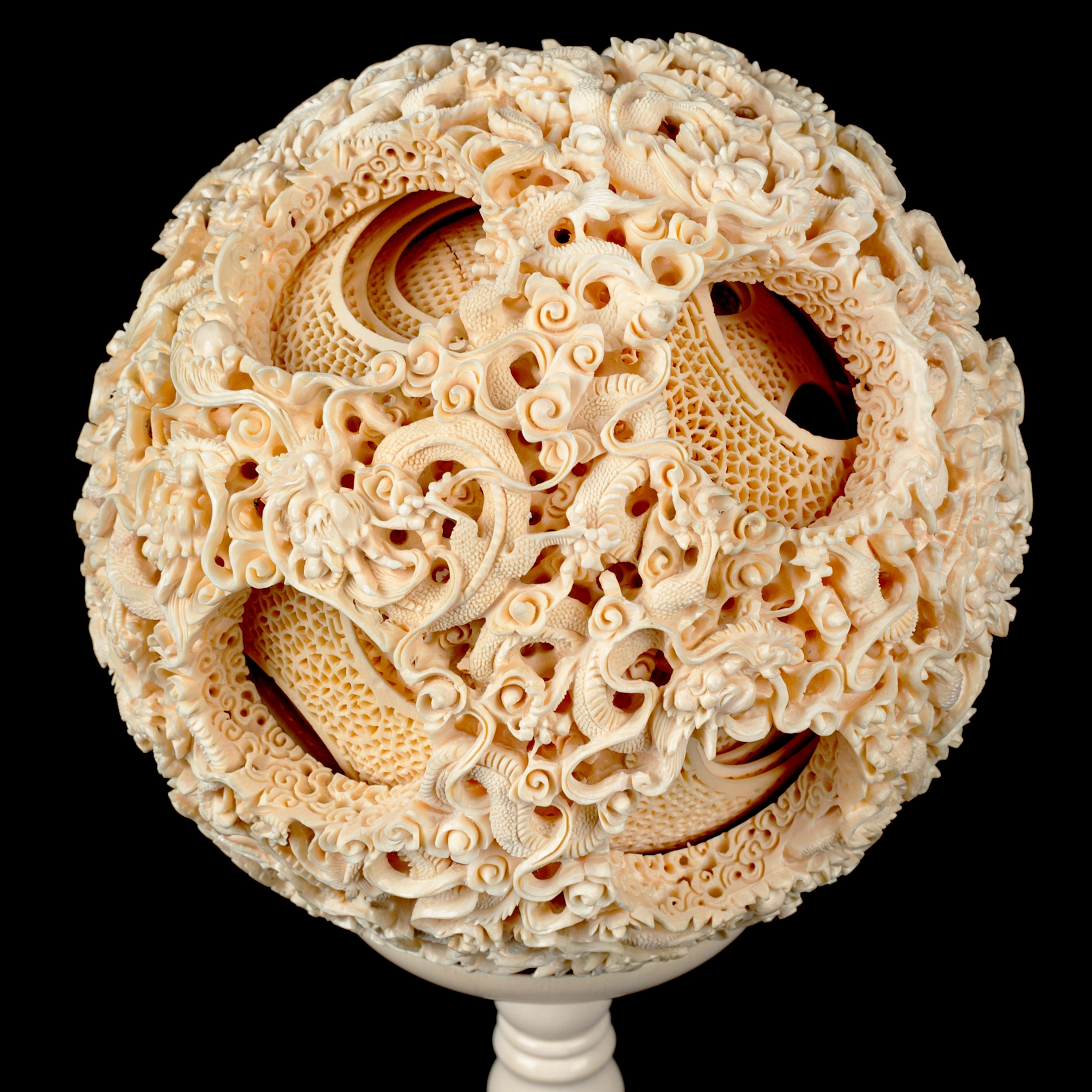 Кантонский шар из слоновой кости, известный также как «призрачный шар», — один из наиболее характерных видов гуанчжоуской резьбы, сформировавшийся ещё в эпоху династии Мин. Его уникальность заключается в том, что цельный фрагмент кости выдалбливается в многослойную сферу с переплетающимися ажурными оболочками. Каждый слой тонко проработан собственным сквозным орнаментом и может свободно вращаться внутри последующего, создавая впечатление лёгкости и почти невесомой прозрачности.