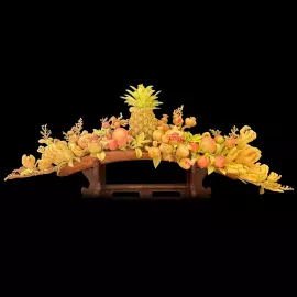 Композиция из бивня мамонта «Сандуо» представляет собой изысканное декоративное произведение, построенное на символике изобилия и благополучия, воплощённой в образах плодов и даров природы. Изделие выполнено из бивня мамонта с естественным переходом оттенков — от мягкого кремового до насыщенного золотистого, что придаёт композиции тёплое сияние и подчёркивает её художественную выразительность. Центральным акцентом выступает ананас — традиционный символ богатства и удачи, возвышающийся над изобилием фруктов, расположенных на плавно изогнутой основе.