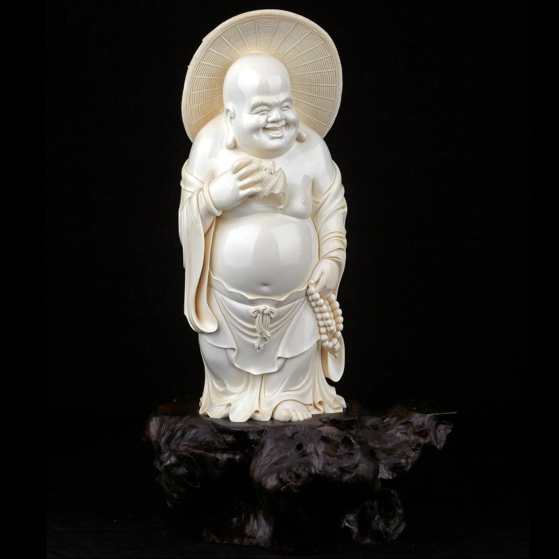 Фигура с округлым телом и спокойной, добродушной улыбкой символизирует полноту жизни, изобилие и внутреннюю свободу. Большой живот традиционно считается знаком достатка и способности «вмещать» в себя радости мира, а также принимать жизнь такой, какая она есть. Чётки в руке указывают на связь с духовной практикой, напоминая о том, что истинное счастье рождается из внутреннего состояния, а не только из внешних обстоятельств.
