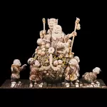 Вокруг старца расположены дети, изображённые в живых и радостных позах. В китайской традиции многочисленные детские фигуры символизируют счастье, продолжение рода и благословение семьи. Их улыбки и жесты создают ощущение праздника, словно они встречают небесное благословение, которое приносит старец долголетия.
