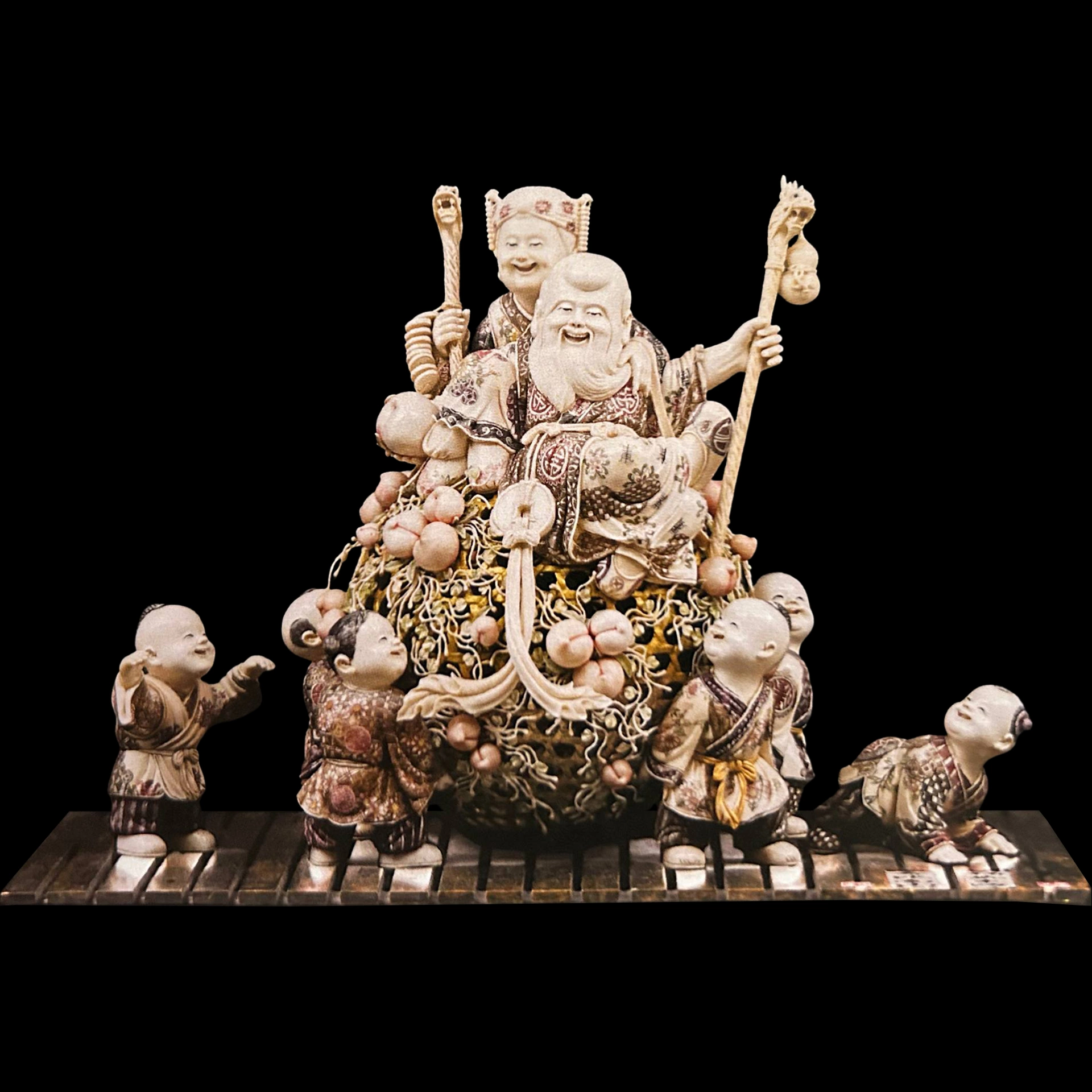 Тонкая резьба по бивню мамонта передаёт мельчайшие детали — выражения лиц, складки одежды, ветви и плоды, создавая впечатление ожившей сцены. Композиция наполнена мягкой динамикой и доброй атмосферой, характерной для традиционного китайского искусства благопожелательных сюжетов.