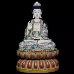 Одежды бодхисаттвы украшены сложными орнаментами, выполненными с тончайшей проработкой. Рельефные узоры напоминают изысканные ткани и подчеркивают торжественный характер образа. Украшения на груди и головной убор дополняют композицию, усиливая ощущение священного достоинства фигуры. Каждая деталь — от складок одежды до декоративных элементов — выполнена с высокой точностью и вниманием к художественной гармонии.