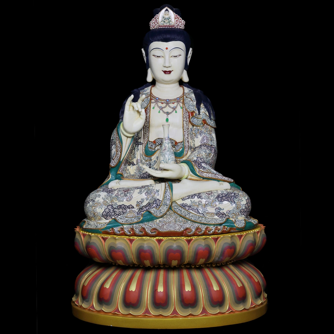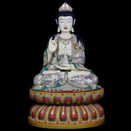 Фигура установлена на многоярусном основании в виде лотосового трона. Лепестки лотоса окрашены в насыщенные оттенки красного, золотого и тёплых тонов, что создаёт выразительный контраст со светлой поверхностью мамонтовой кости. Лотос в буддийской символике означает чистоту духа, возникающую из мира страданий, и подчёркивает духовную природу бодхисаттвы.