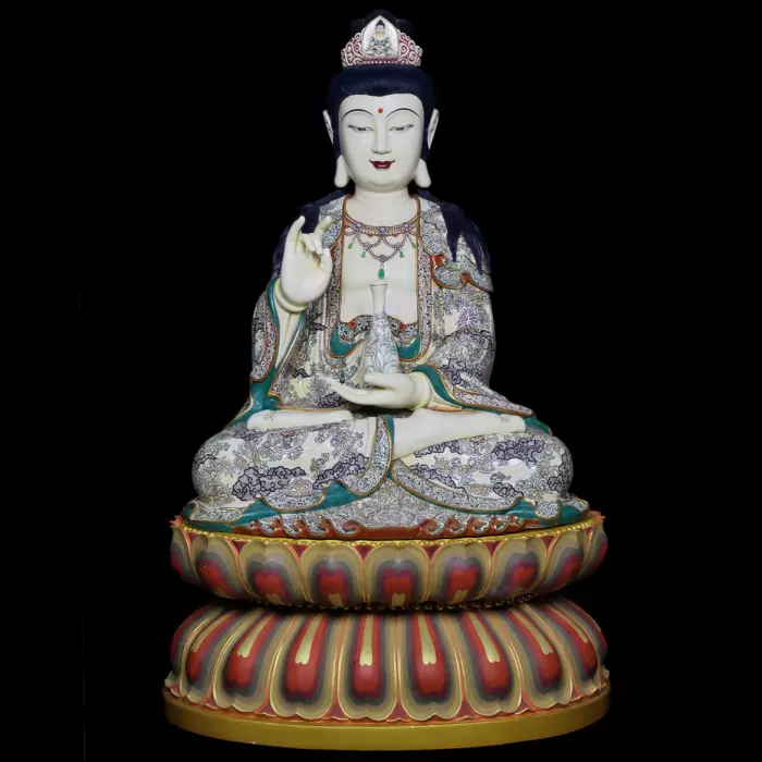 Фигура Гуаньинь изображена в спокойной медитативной позе. Лицо бодхисаттвы отличается мягким, умиротворённым выражением, передающим состояние глубокого внутреннего покоя и сострадания. Глаза слегка прикрыты, а тонкая улыбка создаёт ощущение благожелательности и духовной гармонии. Правая рука поднята в жесте благословения и защиты, тогда как левая удерживает сосуд — традиционный атрибут, связанный с очищением и исцелением.
