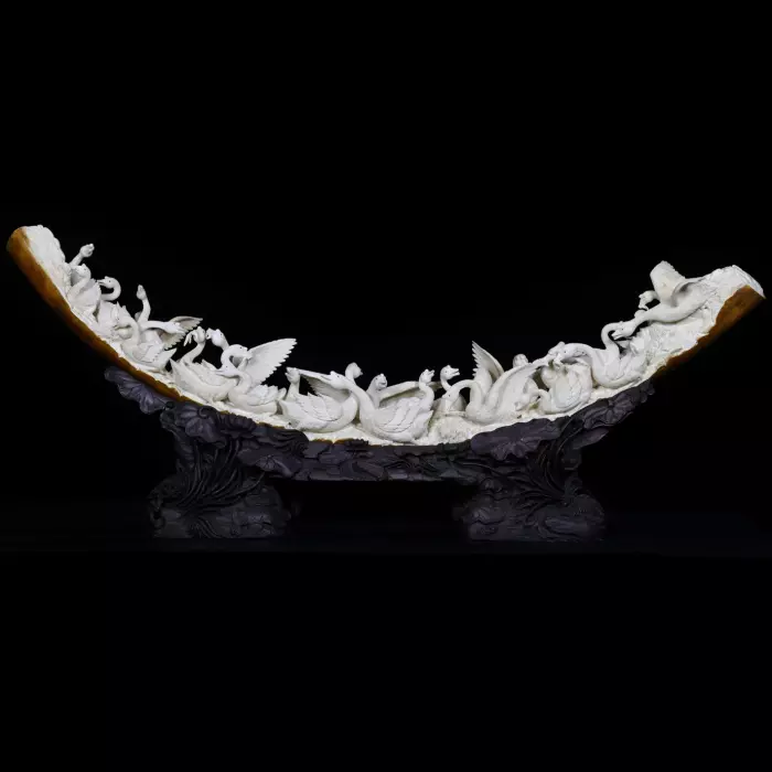 Композиция из бивня мамонта «Симфония лебедей» представляет собой изящное произведение, в котором природная форма материала превращена в гармоничную, наполненную движением сцену. Цельный бивень, сохраняющий плавный изгиб и естественные переходы оттенков — от молочно-белого до тёплого янтарного на концах, — становится основой для развёрнутой композиции. Светлая резьба контрастирует с тёмным, скульптурно проработанным основанием из древесины, создавая эффект лёгкости и словно парящего над опорой ансамбля.