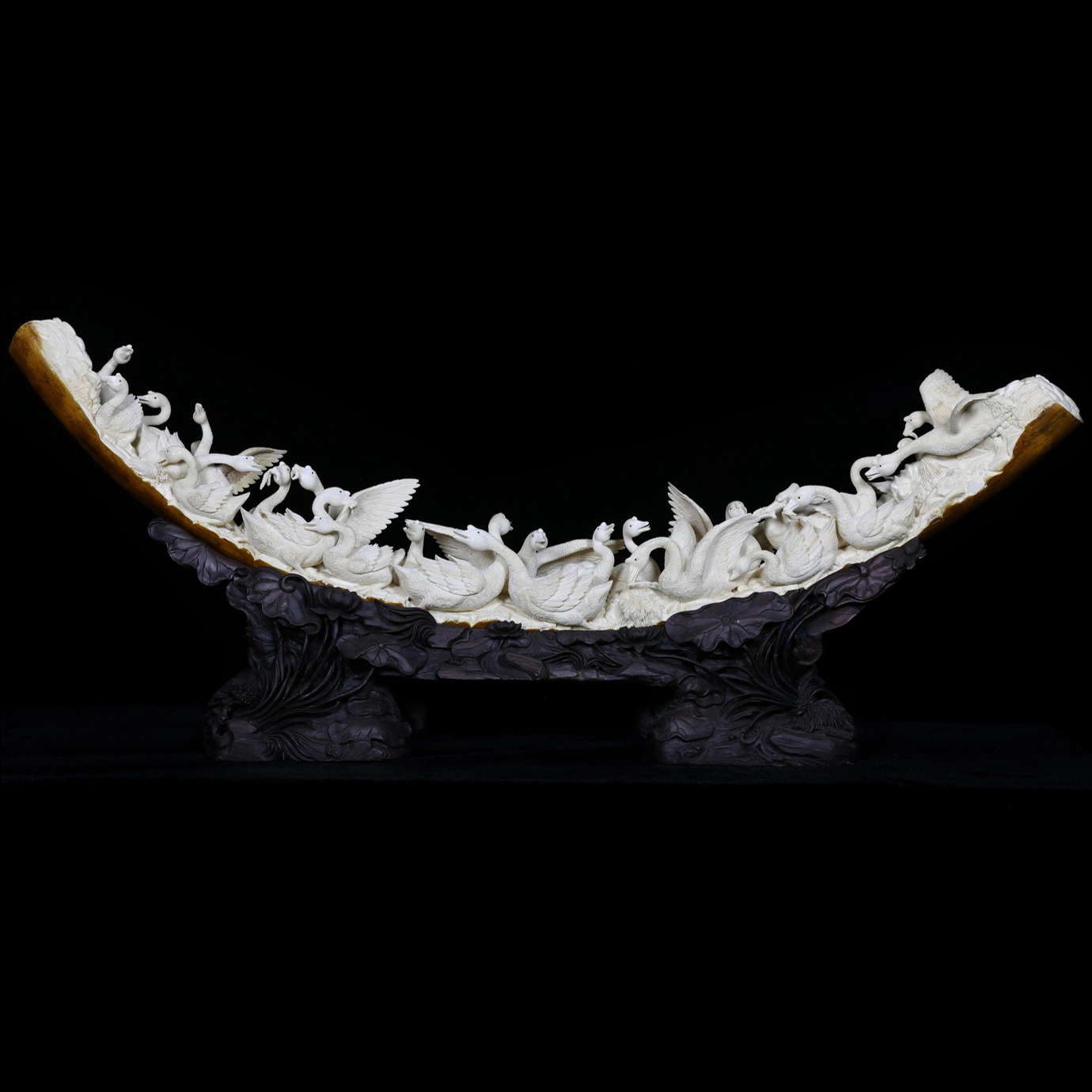Мастерство кантонской резьбы проявляется в тончайшей детализации: проработаны перья, пластика крыльев, изгибы шей и характерные позы. Многослойный рельеф создаёт глубину, благодаря чему сцена воспринимается объёмной и живой. Линии повторяют естественный изгиб бивня, усиливая ощущение текучести и мягкости, а игра света на поверхности подчёркивает сложность композиции.