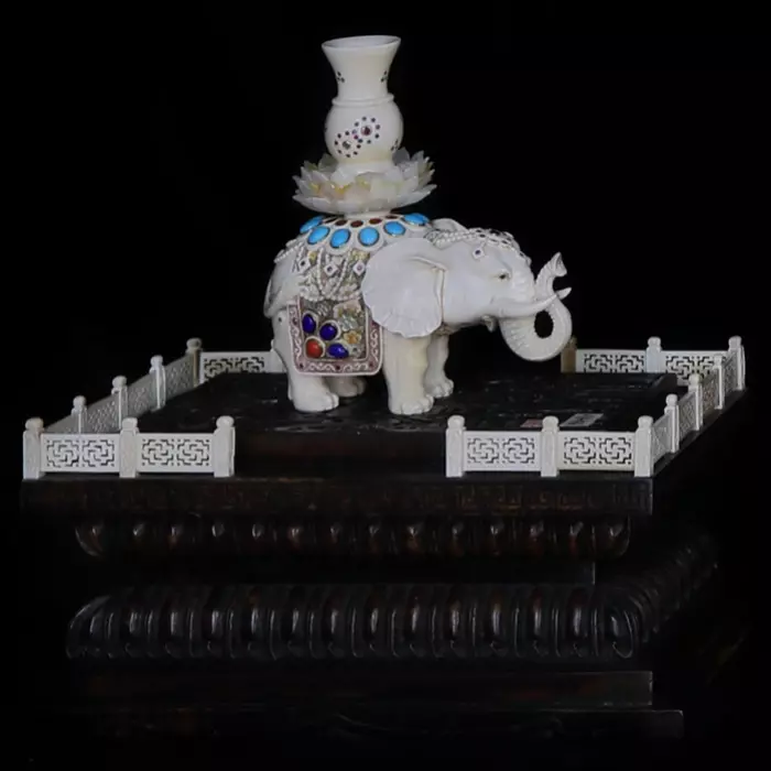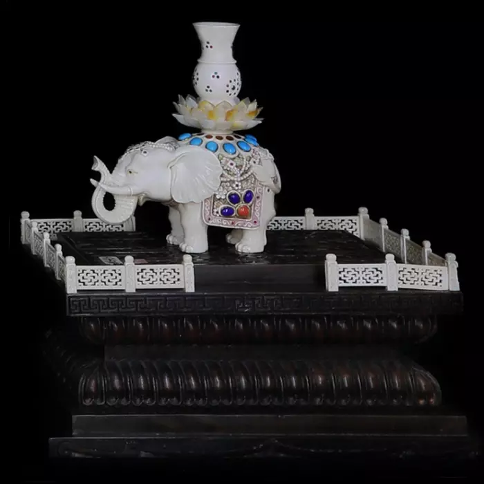 Дополнительный смысл придаёт композиции сосуд, размещённый на спине животного. В китайской символике подобные сосуды связаны с изобилием, накоплением благ и сохранением энергии. В сочетании со слоном это образ устойчивого благополучия — не случайного, а выстроенного на прочной основе и сохраняющегося во времени.