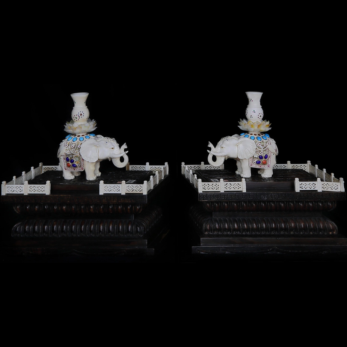 Парность композиции усиливает значение гармонии. В китайской эстетике парные предметы воспринимаются как отражение баланса инь и ян, взаимодополняющих сил, создающих целостность. Два слона, обращённые друг к другу, формируют замкнутое пространство согласия, в котором энергия не рассеивается, а циркулирует, усиливая ощущение стабильности и порядка.