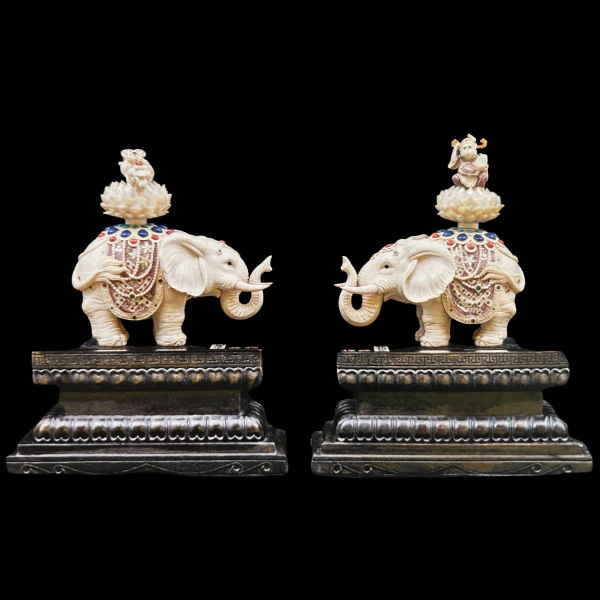 Главными героями сцены выступает пара слонов — животных, которые в китайской культуре символизируют силу, мудрость и устойчивость. Слон ассоциируется с благополучием и миром, а его имя созвучно слову, означающему «счастливое предзнаменование». Пара слонов усиливает этот смысл, создавая образ равновесия и гармонии, где два начала поддерживают друг друга и вместе формируют устойчивость и процветание.