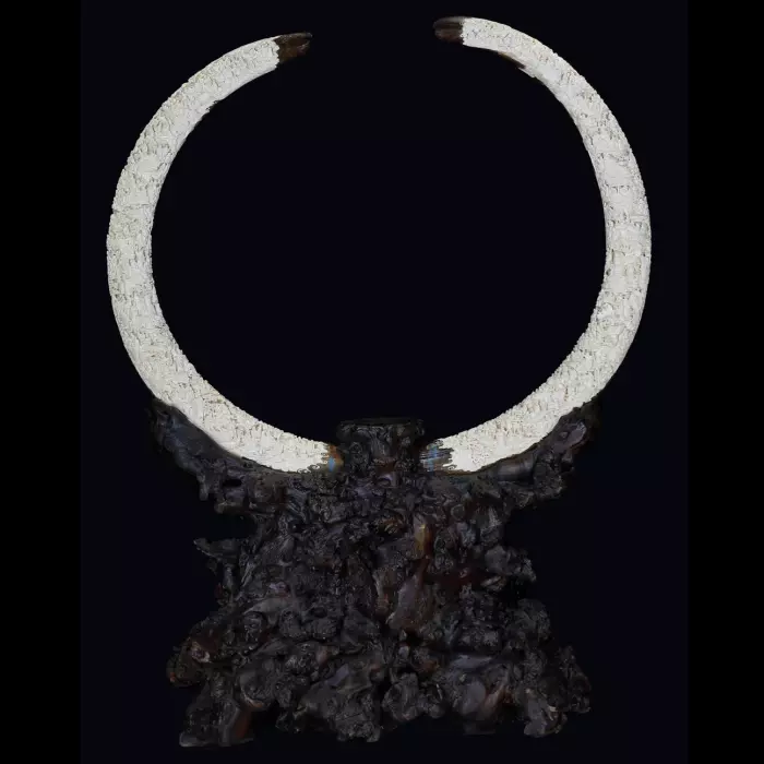 Композиция из бивня мамонта «Собрание героев» представляет собой масштабное произведение художественной резьбы, в котором природная форма древнего материала превращена в сложную повествовательную сцену. Основой композиции служит огромный бивень мамонта, пролежавший в вечной мерзлоте тысячи лет. Его плавный изгиб образует почти идеальную дугу, напоминающую небесный свод или древнюю арку, под которой разворачивается многослойная скульптурная история.