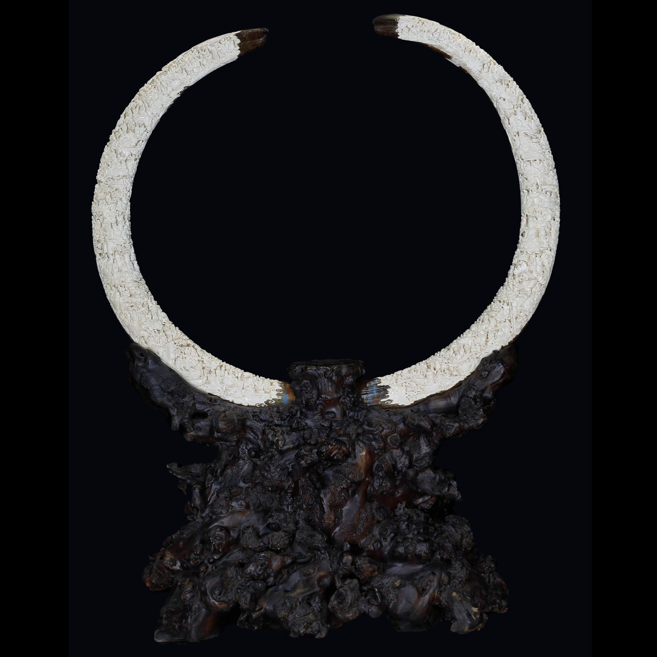Особое впечатление производит масштаб работы. Огромное количество миниатюрных фигур, архитектурных элементов и декоративных деталей требует исключительной точности и мастерства. Каждая сцена тщательно проработана, а общий ритм композиции подчинён плавной линии природного изгиба бивня.