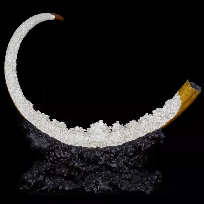 Вдоль внутренней поверхности бивня выполнена тончайшая рельефная резьба, создающая насыщенную многослойную композицию. На светлой поверхности мамонтовой кости развёрнуты многочисленные фигуры монахов, мудрецов, небесных существ и паломников. Они изображены в разных позах и действиях — беседуют, слушают учение, совершают церемонии, собираются вокруг центральных фигур. Такое расположение создаёт ощущение огромного духовного собрания, где каждая фигура является частью единого пространства.