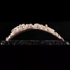 Мастерство кантонской резьбы проявляется в тончайшей проработке деталей: каждая птица обладает индивидуальной пластикой, различимы перья, повороты голов и лёгкие вариации поз. При этом композиция сохраняет цельность — взгляд свободно скользит по линии бивня, не встречая резких переходов. Многослойный рельеф и аккуратная работа с глубиной создают ощущение пространства, несмотря на компактность формы.