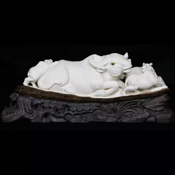 Композиция из бивня мамонта «Связь быков: где язык говорит о нежности» представляет собой камерную скульптурную сцену, наполненную редкой для монументальной пластики мягкостью и эмоциональной глубиной. Основа выполнена из цельного бивня мамонта, обладающего характерной бархатистой фактурой и благородными природными оттенками — от холодного белого до теплого сливочного. Фигура крупного быка, лежащего в спокойной, уверенной позе, становится центром композиции, вокруг которого разворачивается тихий, почти интимный сюжет взаимодействия животных. Подставка из тёмной древесины с выразительной резьбой напоминает природный рельеф, усиливая ощущение живой среды.