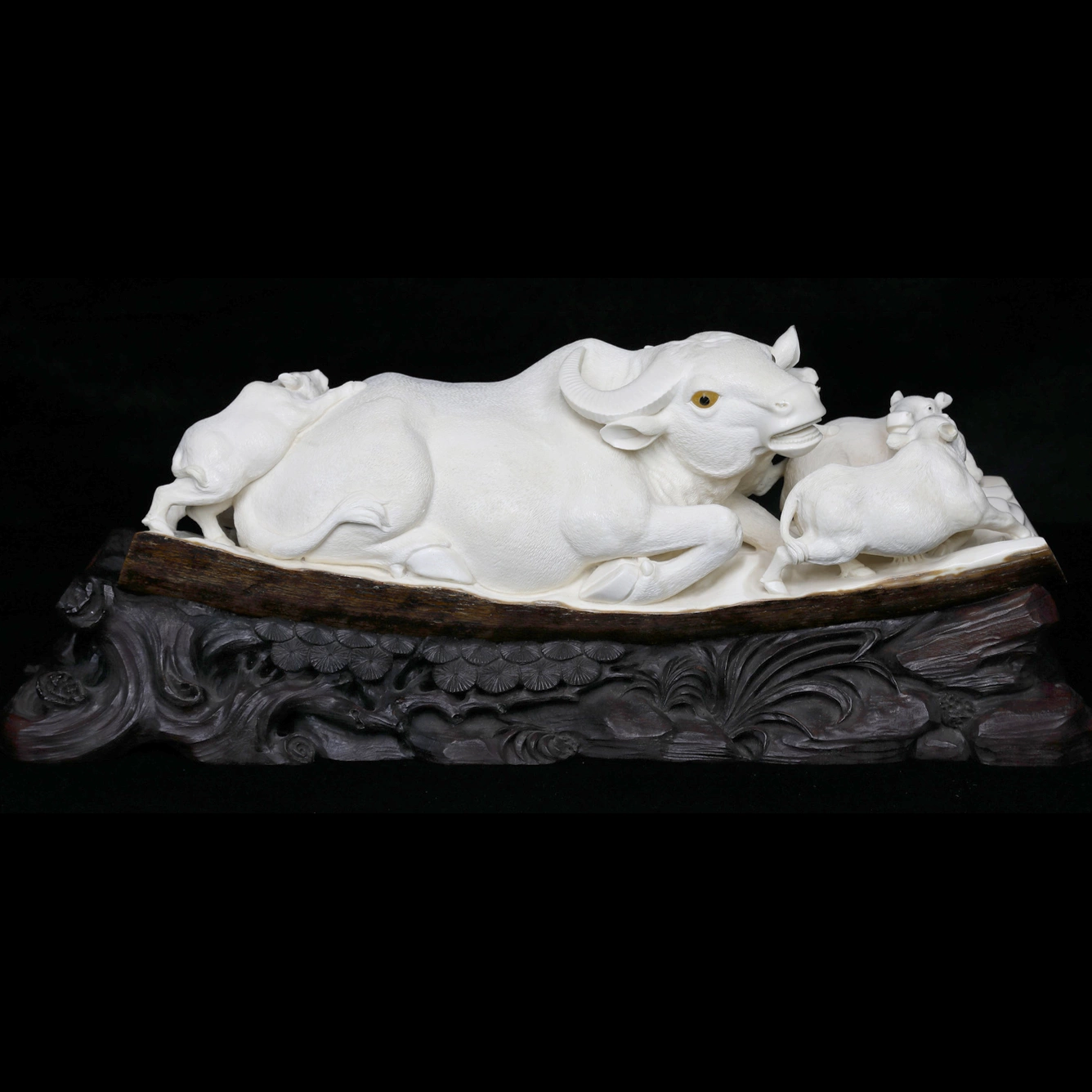 Кантонская техника резьбы проявляется в тончайшей передаче фактуры: кожа животных передана с деликатной матовостью, формы мягко моделированы, линии лишены резкости, что подчёркивает естественность и органичность образов. Детали проработаны с высокой точностью — от изгиба рогов до выражения глаз, в которых читается спокойствие и внимательное присутствие. Контраст светлого бивня и насыщенного тёмного основания усиливает глубину композиции и акцентирует внимание на пластике фигур.