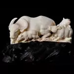 Композиция из бивня мамонта «Свиток пяти буйволов» представляет собой пластическое воплощение традиционного восточного сюжета, переосмысленного в материале с глубокой историей. Скульптура выполнена из цельного бивня мамонта, отличающегося мягким молочным оттенком и благородной фактурой, передающей ощущение тепла и живой материи. Изделие установлено на массивном резном основании из тёмного дерева, создающем выразительный контраст и подчёркивающем светлую скульптурную группу.