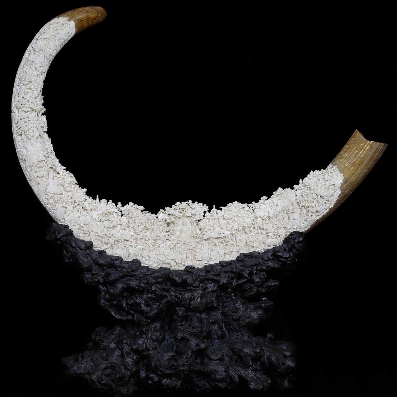 Композиция из бивня мамонта «Три Святых Хуаянь» представляет собой редкое произведение художественной резьбы, соединяющее древний природный материал и глубокую философскую традицию буддийского искусства. Основой композиции служит массивный бивень мамонта, сохранивший естественный изгиб. Его дуга образует величественную линию, напоминающую свод небесного пространства или очертание священных гор, на фоне которых разворачивается сложная многофигурная сцена.