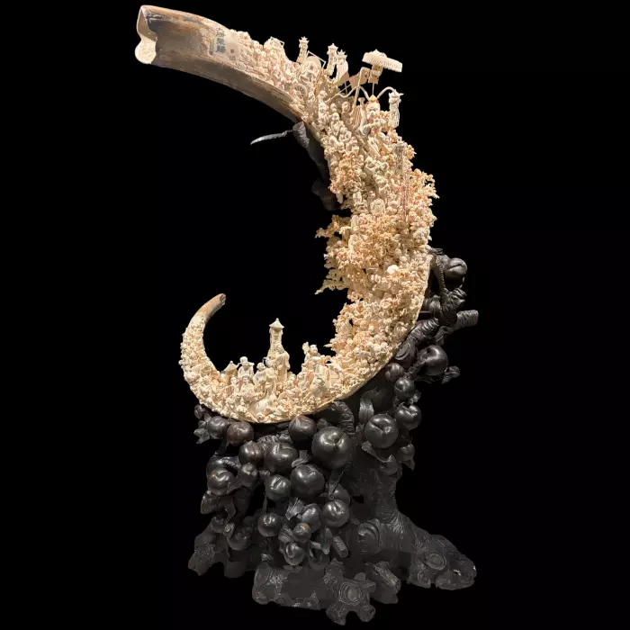 Композиция из бивня мамонта «Триумфальное возвращение Царя обезьян» — масштабное произведение, выполненное из цельного бивня мамонта с использованием техник объёмной резьбы, рельефа и ажурной проработки. В основе сюжета — величественная сцена возвращения Сунь Укуна, Царя обезьян, в ореоле славы. Произведение обращается к классическому наследию «Путешествия на Запад», переосмысляя его в пластике драгоценного материала, богатого исторической ценностью. Бивень, превращённый в изогнутую небесную дугу, становится носителем многослойного повествования: здесь и небесный дворец, и фигуры небожителей, и ликующие спутники героя, встречающие его у врат небес.