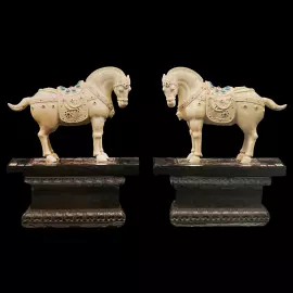 Центральный образ композиции — пара благородных лошадей, выполненных с тонкой выразительностью и внутренней динамикой. В китайской символике лошадь считается воплощением силы, энергии и стремительного продвижения вперёд. Она связана с идеей победы, карьерного роста и достижения высоких целей. Именно поэтому изображение лошади традиционно дарят людям, начинающим новое дело, отправляющимся в важное путешествие или стремящимся к профессиональному успеху.